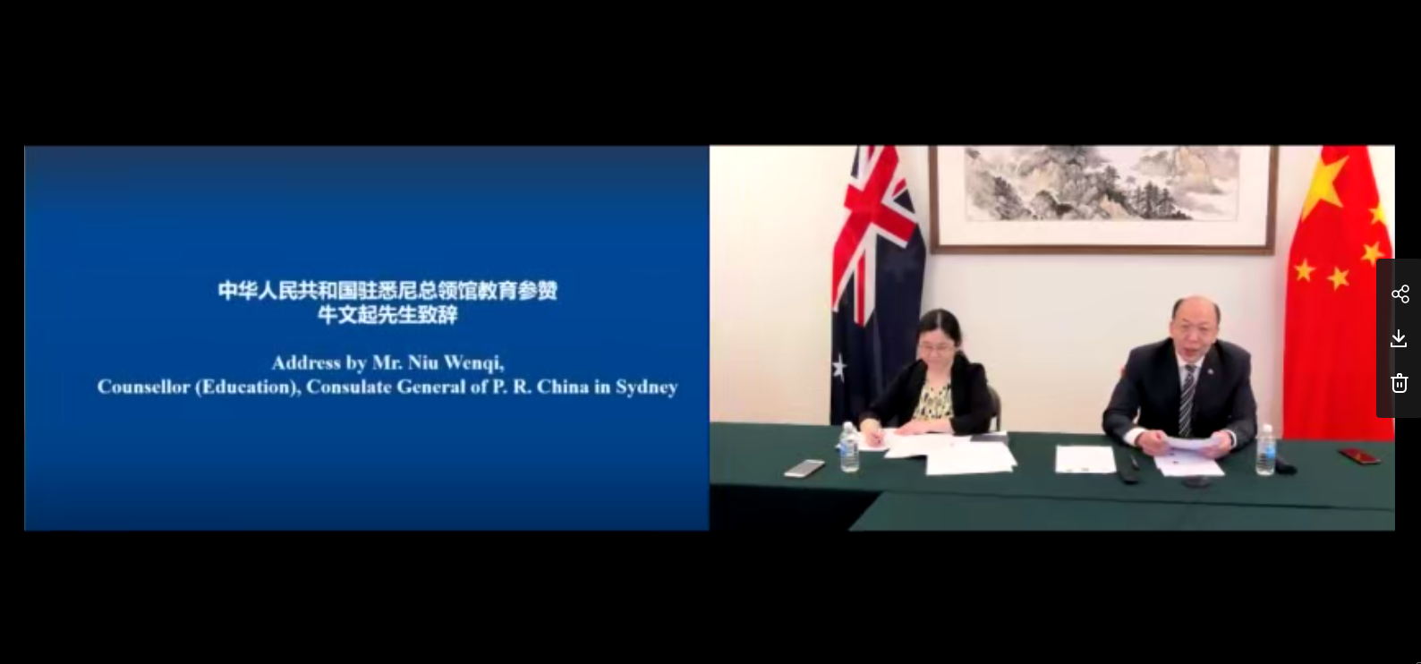 中国驻悉尼总领馆教育参赞牛文起发表致辞并为孔子学院前任院长潘瑞斯(Rhys Palmer)、中方院长易宏根以及现任院长王家娉(Cher Jones)和中方院长张遗川颁发荣誉证书。