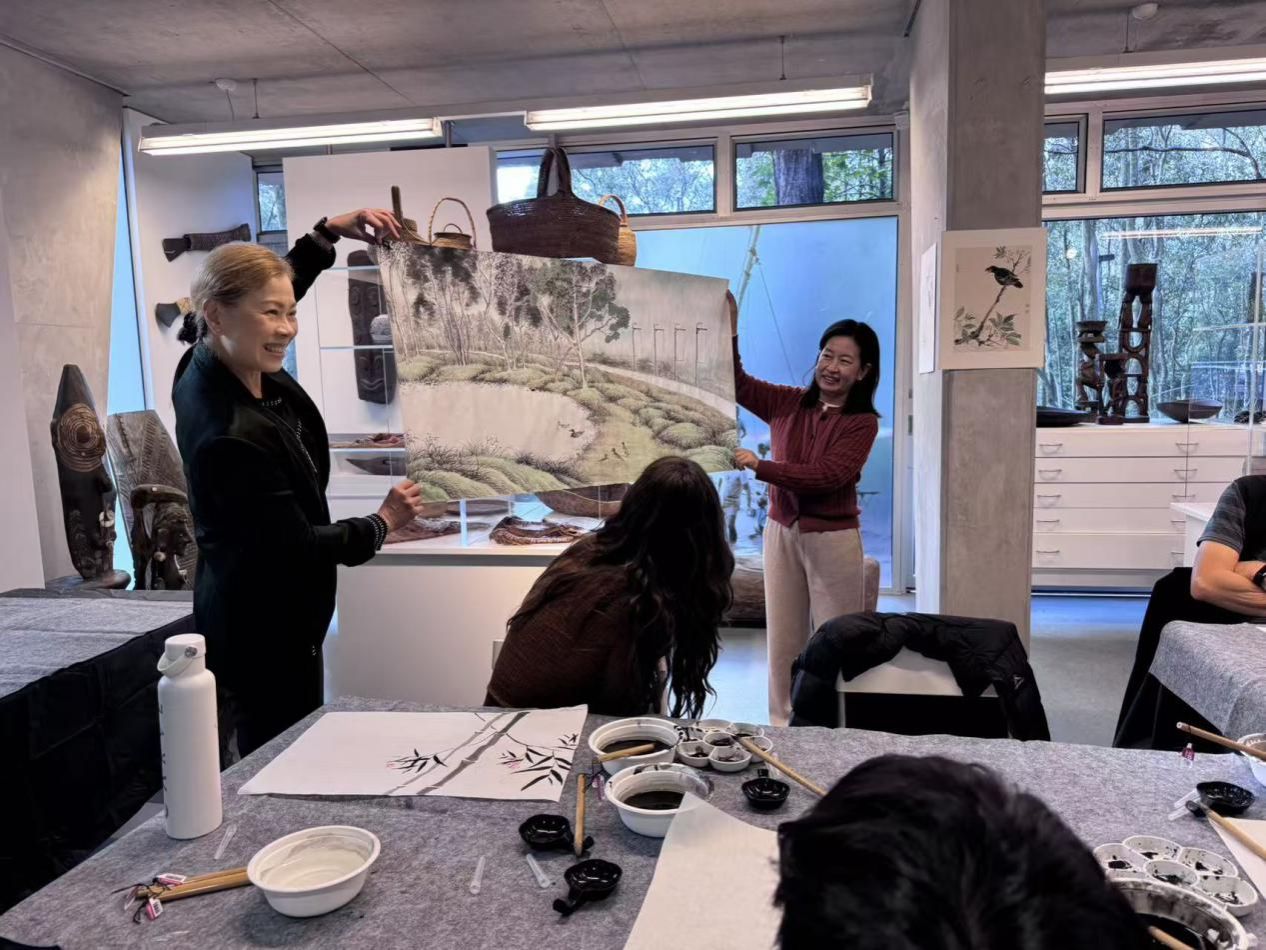 8月18日至19日,孔院教师团队先后在Cooks Hill School、Novoschool和纽卡斯尔大学开展中国水墨画教学活动?;惺Ψ洞笱朗跹г豪罟淌谝浴爸瘛蔽魈?,逐步演示中国写意画的笔墨技法,杨畅院长现场翻译,确保文化理解的准确性,学生们在教师指导下完成了一幅幅各具特色的水墨作品,感受到中国画“以形写神”的审美意蕴。