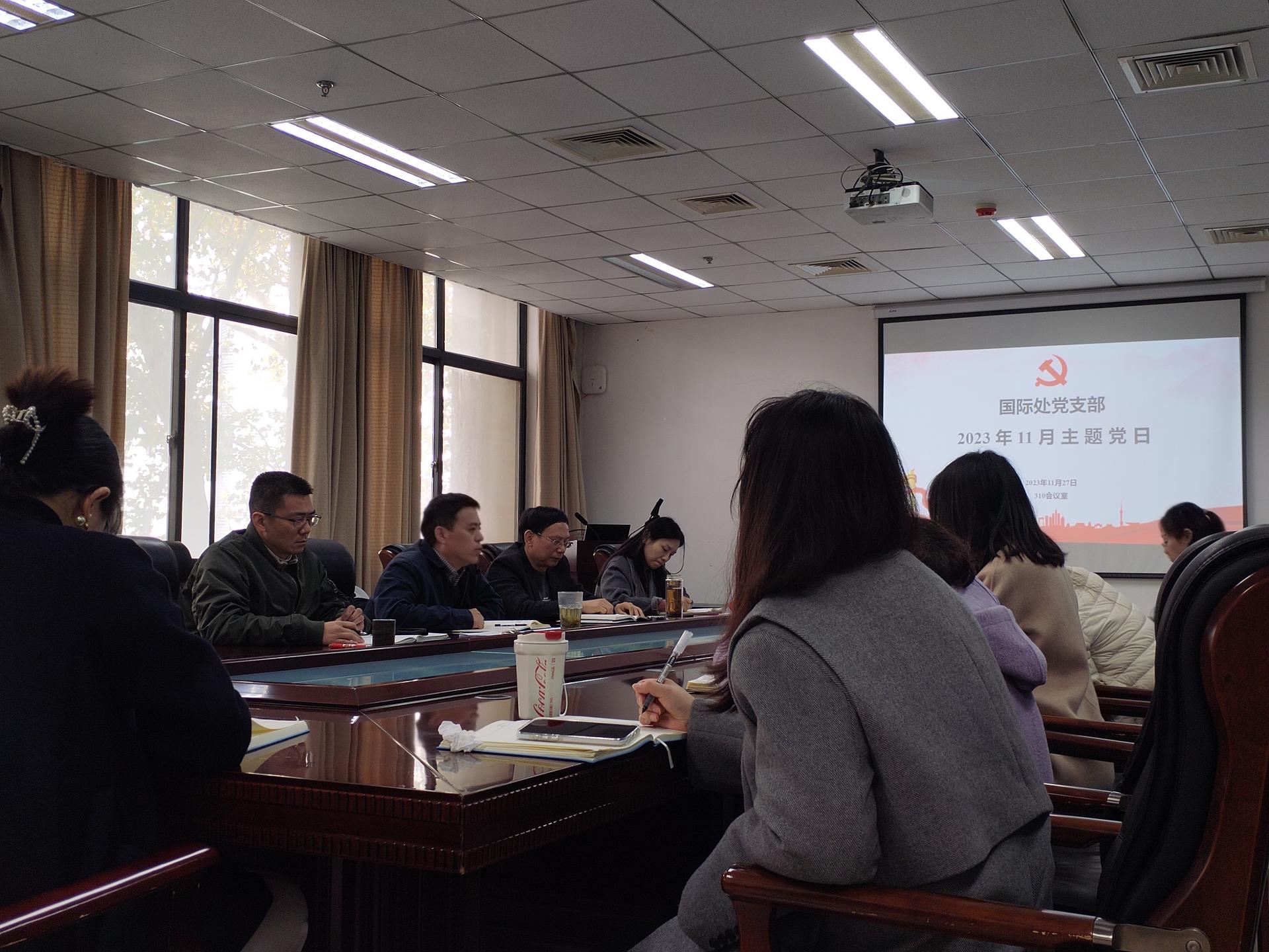 2023年11月27日上午,国际处全体在职在岗党员在310会议室开展11月主题党日活动。学习活动由支部书记洪峰同志主持。