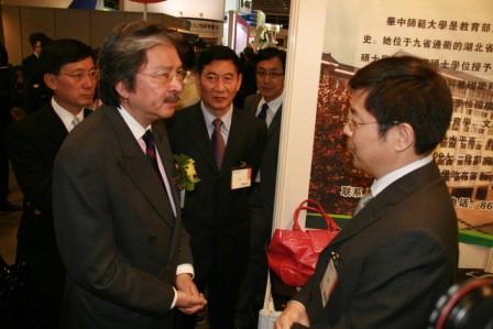 2月19日上午十点,丁烈云书记作为嘉宾参加了“教育及职业博览2009”开幕典礼,各地参展团进行汇合交流,大批香港中学生和家长来到博览会上。香港特区政府财政司司长曾俊华在巡视展览时对我校表示出浓厚兴趣,驻足我校展位与丁烈云书记进行长时间交流,丁烈云书记向曾俊华司长介绍了我校发展和在读港生情况。目前在读博士有34名来自香港,在华中高校首屈一指,本次参加博览会进行宣传,希望能吸引更多的港澳学生,为两地人才培养的交流互动做出更大贡献。《香港文汇报》2009年2月20日刊发了题为《华中师大推非师范专业》新闻和图片。