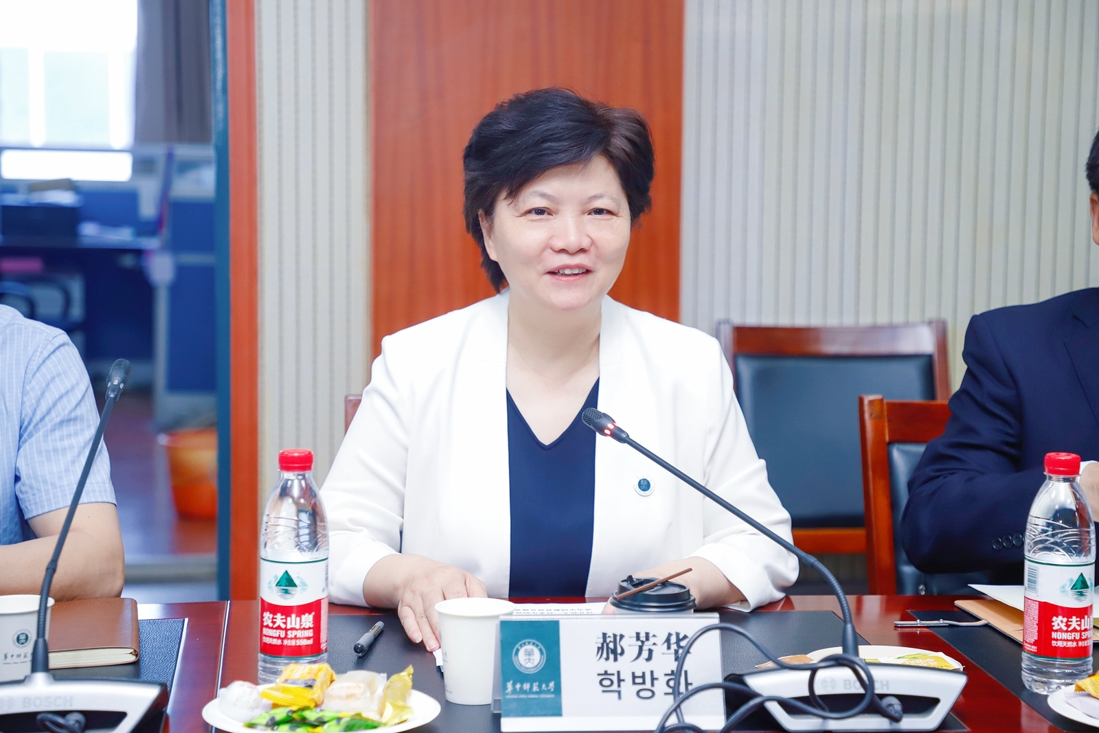 郝芳华代表学校对姜承锡总领事的到访表示热烈欢迎,介绍了我校办学历史和国际化发展情况。她指出,对韩国交流是我校国际合作与交流的重要组成部分,总领事一行此次来访将推动我校对韩国教育交流与合作不断深化。郝芳华表示,今年是“中韩文化交流年”开启之年,明年将迎来中韩建交30周年,希望武汉世宗学堂办出特色,为中韩教育文化交流做出更多贡献,并祝愿双方合作与友谊长存。