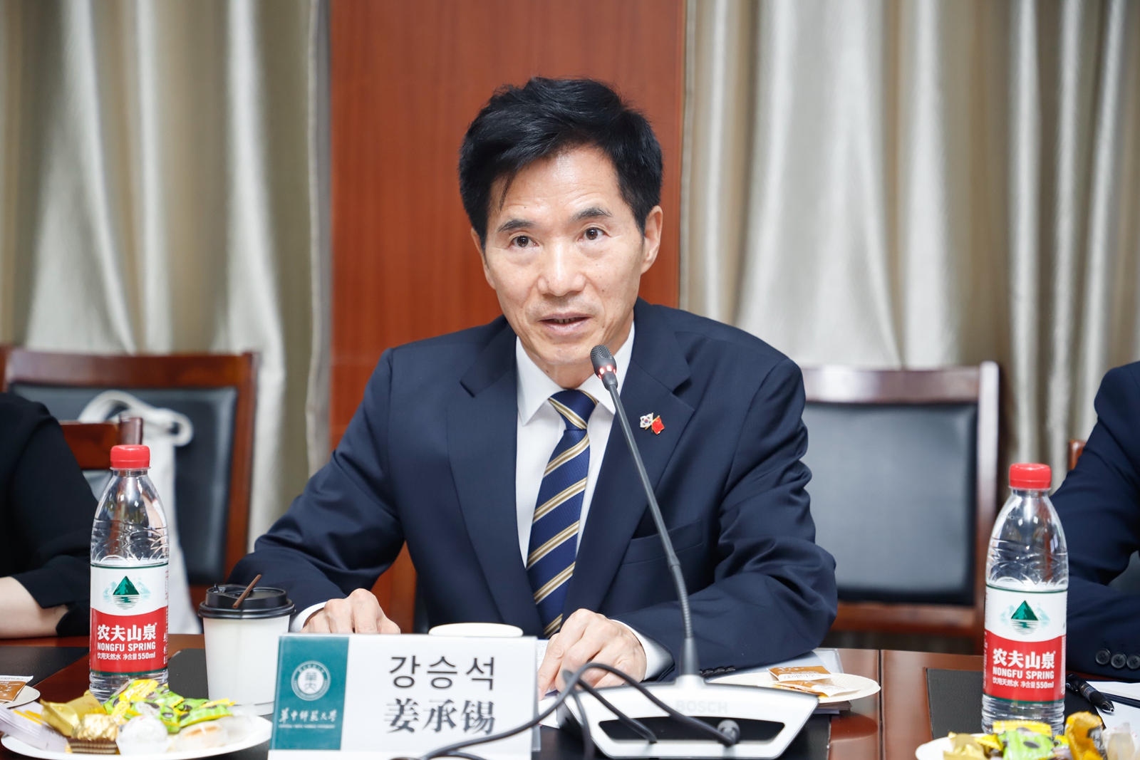 姜承锡感谢我校的热情接待以及对设立武汉世宗学堂给予的大力支持。他表示,华中师范大学历史悠久,是中国师范教育领域的百年名校。韩国驻武汉总领事馆非常重视与华中师范大学的伙伴关系,在中韩建交30周年来临之际,总领事馆将开展系列庆祝活动,为此期待与我校开展更多合作。