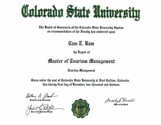 按照科罗拉多州立大学的培养标准,修满32学分的学生,可获得由美国科罗拉多州立大学颁发的旅游管理专业硕士学位证书。